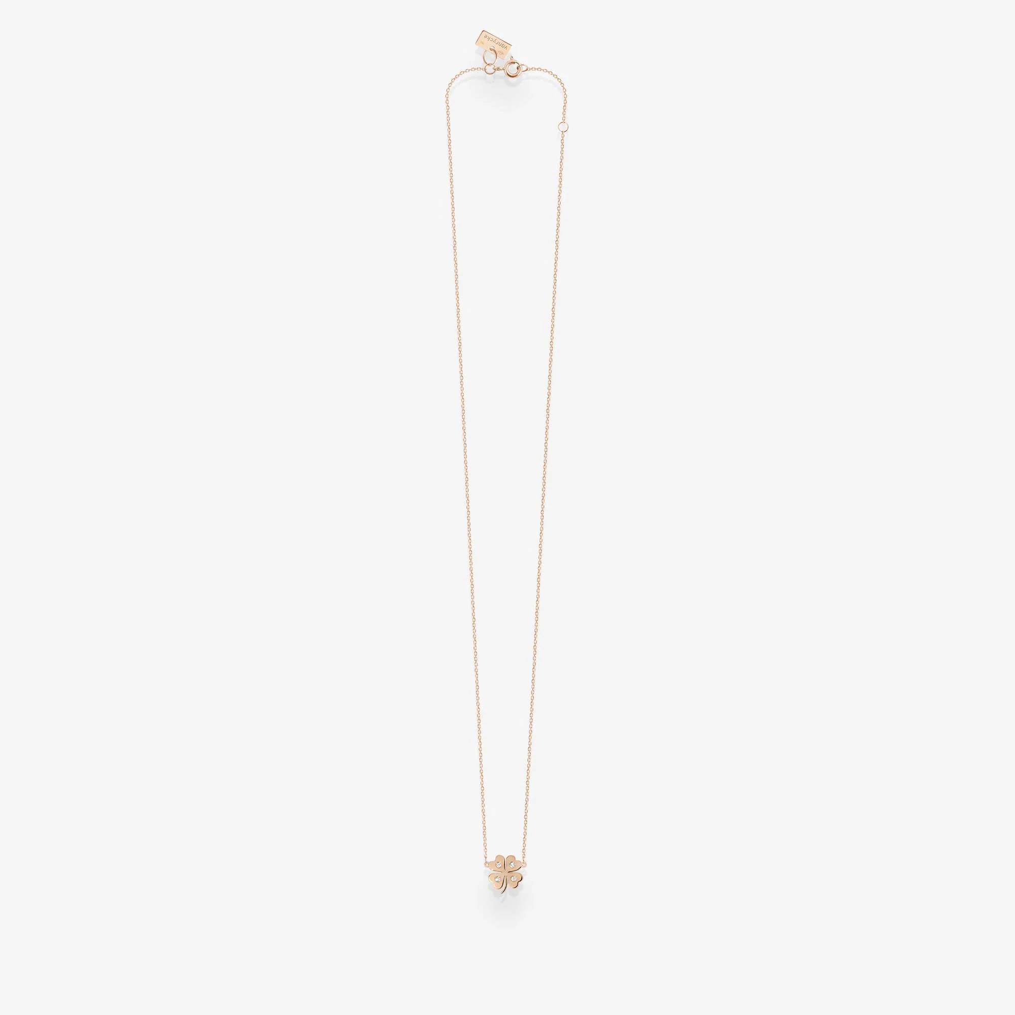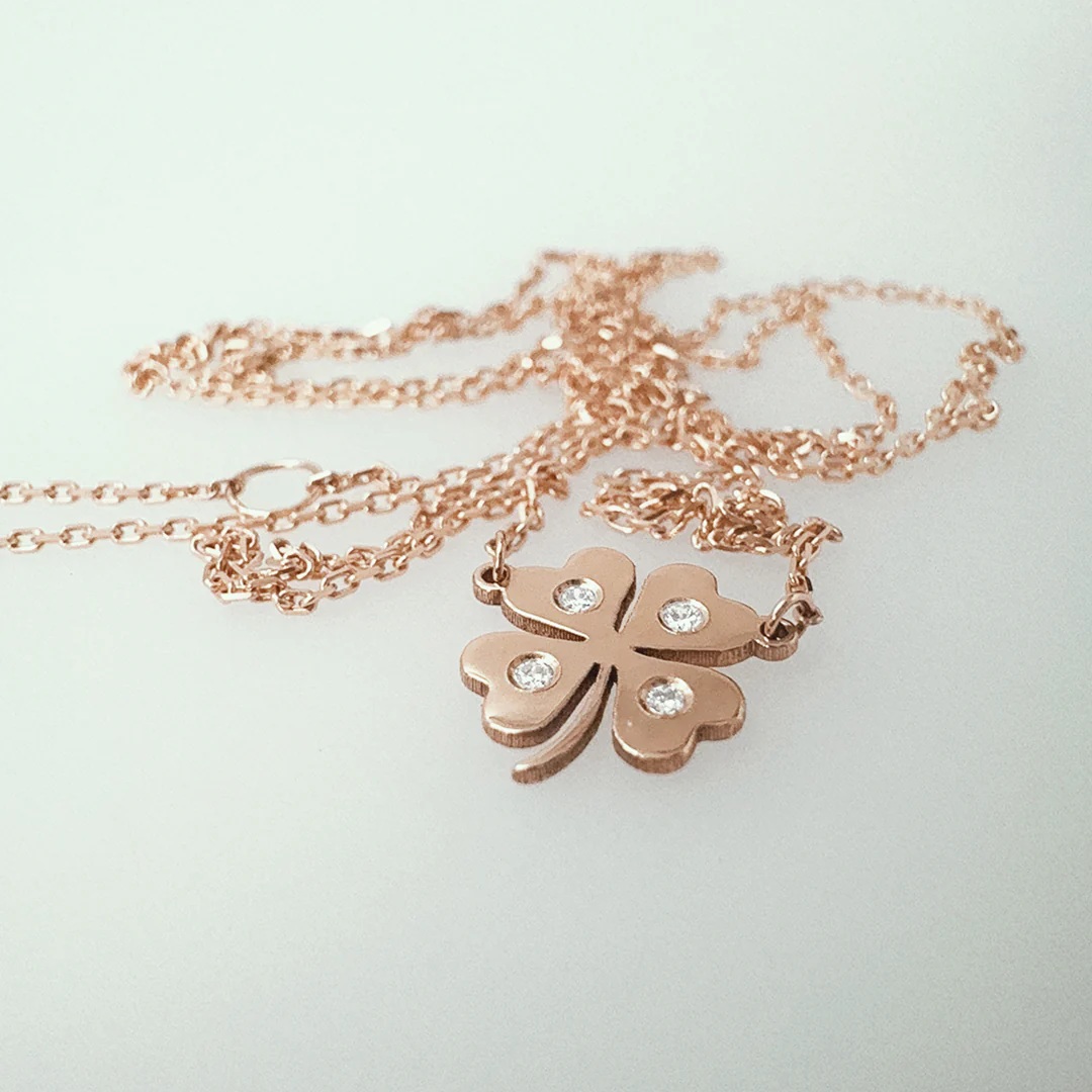 Naszyjnik Trefle z różowego złota 18k z diamentami – koniczyna szczęścia. Dyskretny, a zarazem niezwykle szlachetny. Ten naszyjnik z różowego złota 18k został stworzony, aby uchwycić magię ponadczasowego talizmanu szczęścia. Każdy z czterech listków koniczyny ozdobiono diamentem, który symbolizuje życzenie, więź, siłę i obietnicę. Zawieszony na subtelnym łańcuszku jest biżuterią, która dodaje blasku i dyskretnej elegancji każdego dnia.