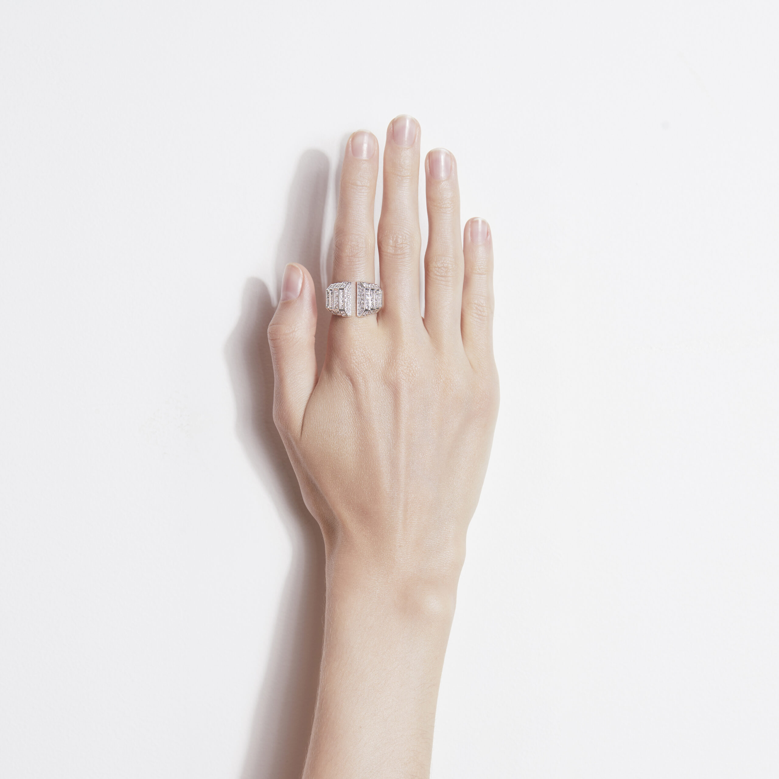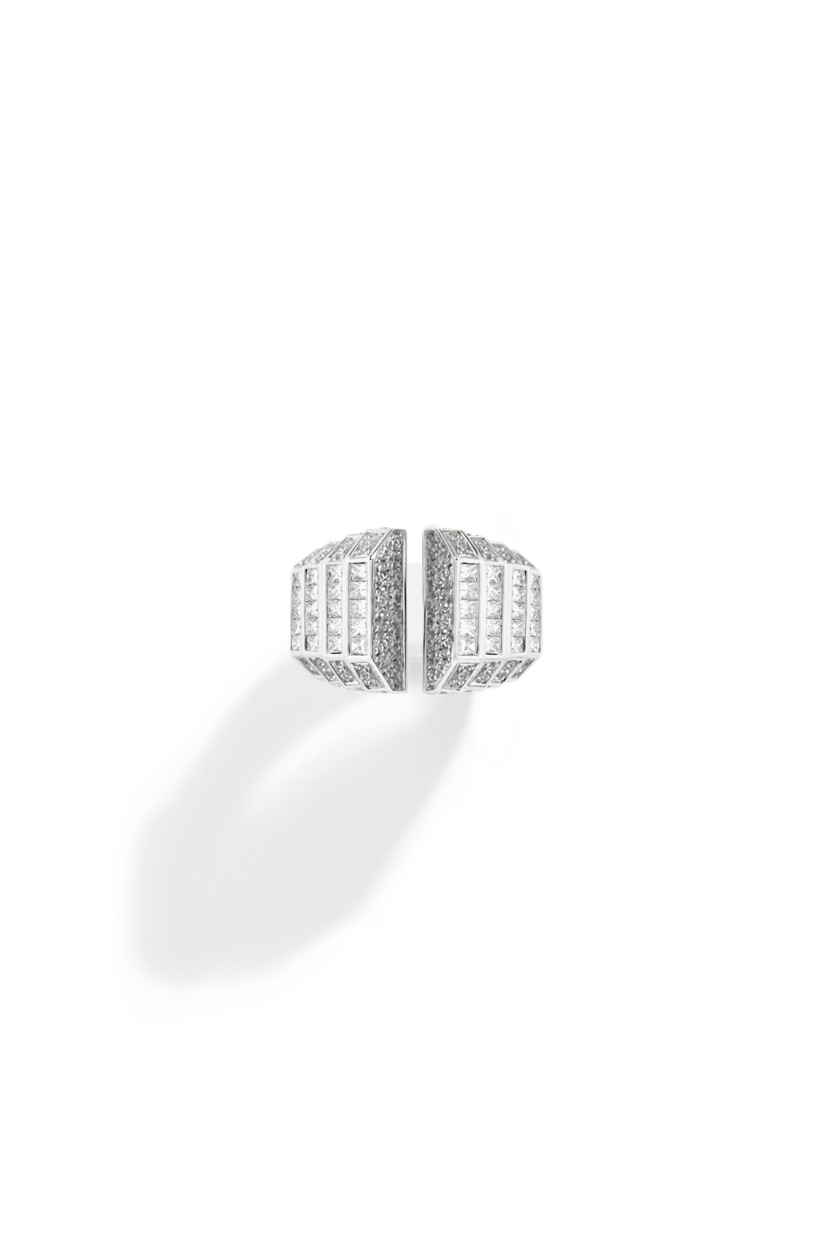 Pierścionek wykonany z rodowanego srebra próby 925, wysadzany 100 diamentami o szlifie brylantowym i princess, o łącznej masie 1,80 ct, w jakości G-VS. To kompozycja, w której symbolika kamieni spotyka się z mistrzowską obróbką metalu – efekt ponad 70 godzin precyzyjnej pracy, gdzie każdy detal ma swoje znaczenie.