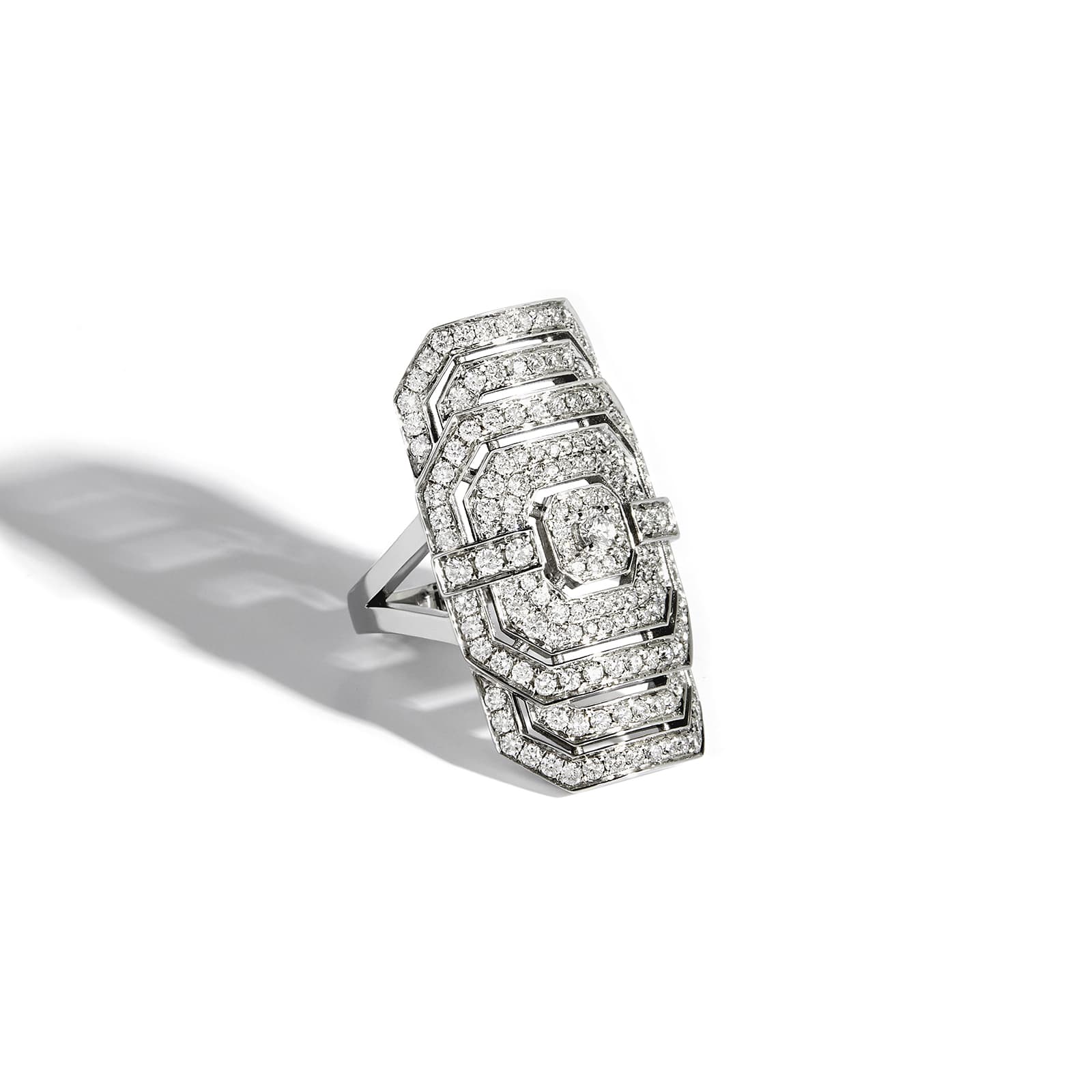 Pierścionek wykonany z 18-karatowego białego złota (15,3 g), wysadzany 157 diamentami o łącznej masie 1,84 ct.