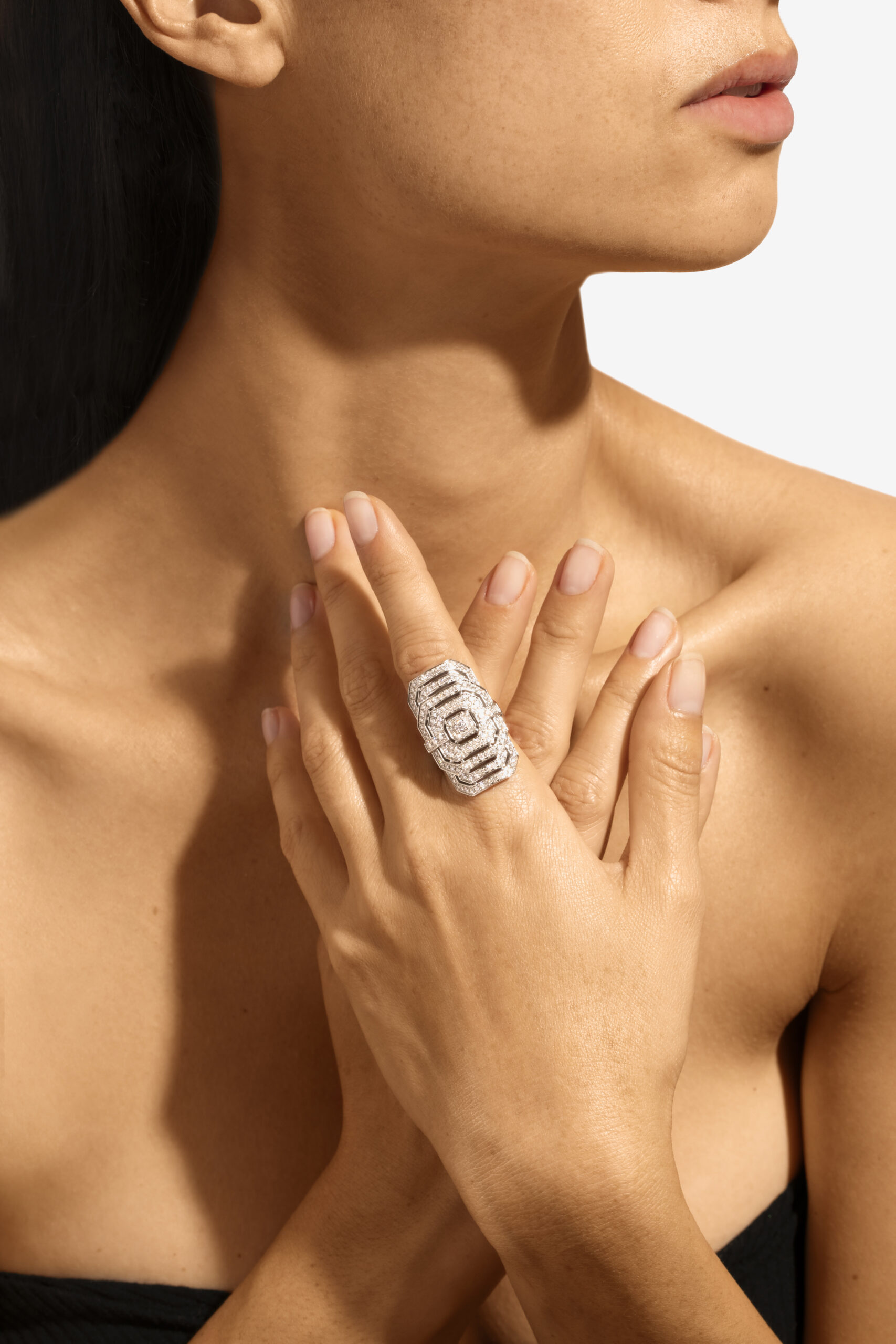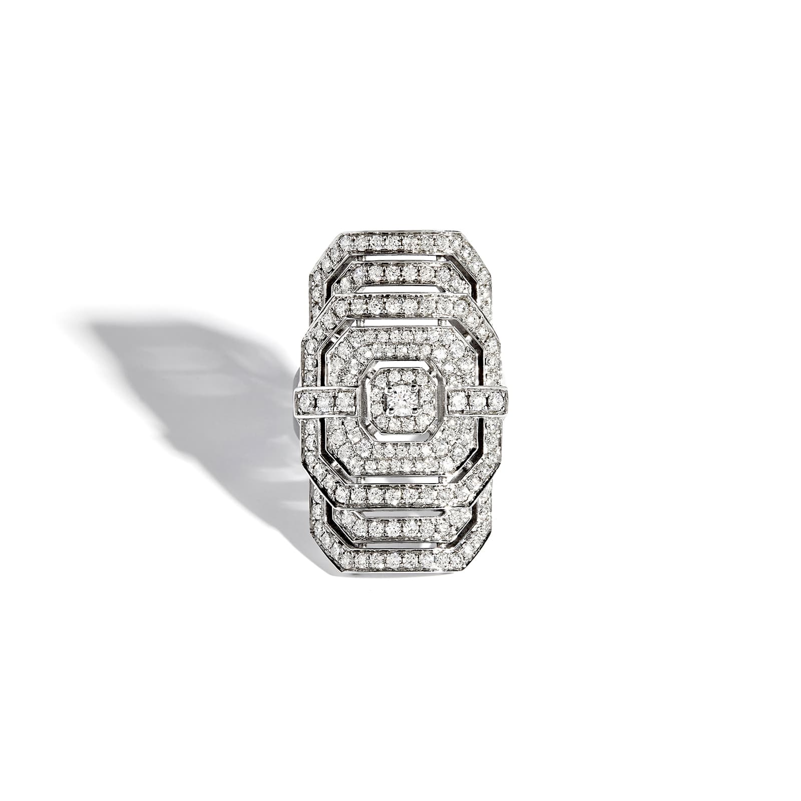 Pierścionek wykonany ze srebra próby 925 pokrytego rodem (9,5 g), wysadzany 157 diamentami o łącznej masie 1,84 ct.