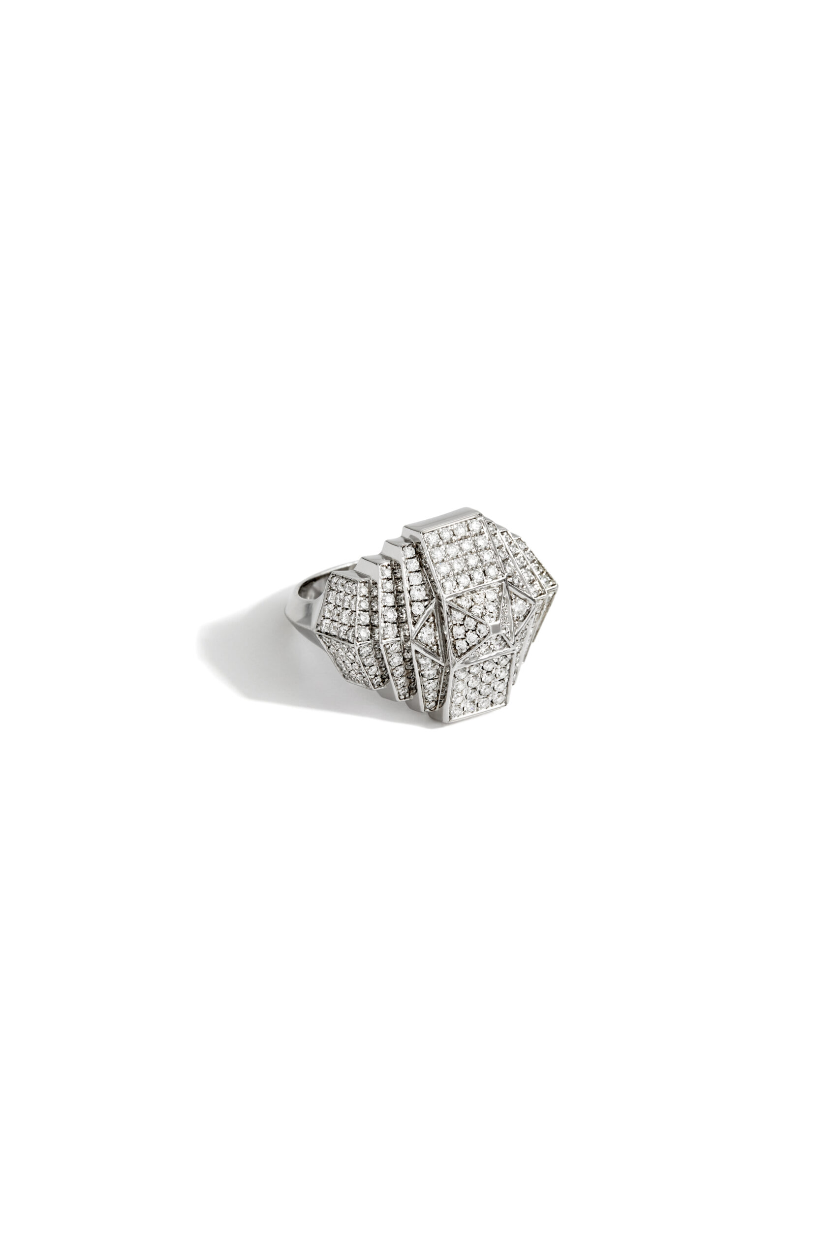 Pierścionek wykonany z rodowanego srebra próby 925 (12 g), wysadzany 178 diamentami o łącznej masie 1,14 ct.